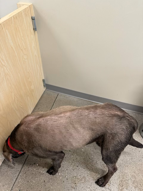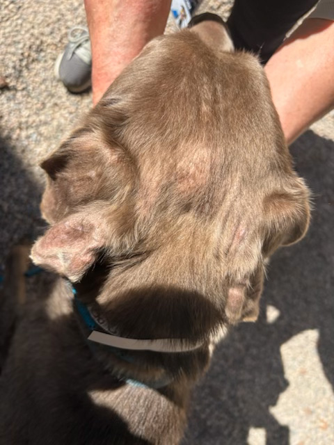 Toby, a beautiful silver Lab, came to DLRR in March 2025 after being found as a stray. It was clear that he was suffering from serious skin issues and hair loss, so DLRR arranged for him to undergo a series of tests with a dermatology specialist. In addition to his skin problems, Toby also had a urinary tract infection and hookworms, all of which contributed to his discomfort. Despite all of that, he remained a gentle and loving dog who was friendly to everyone he met.