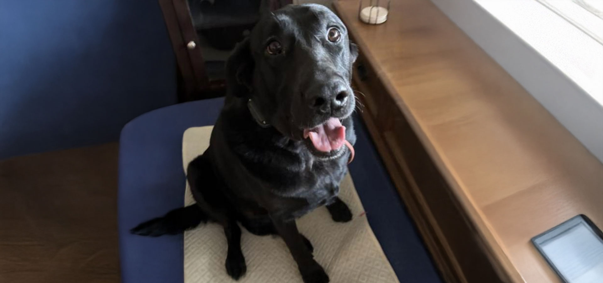 I was found as a stray and I am so thankful DLRR saved me. I am an exceptionally cute guy! I have the softest, thickest, shiniest, most beautiful coat with a little white patch on my chest (easy to pick me out of a lineup of those generically handsome purebred Labs), the whitest teeth, a little fringe on my tail and the pinkest tongue (more on that later).